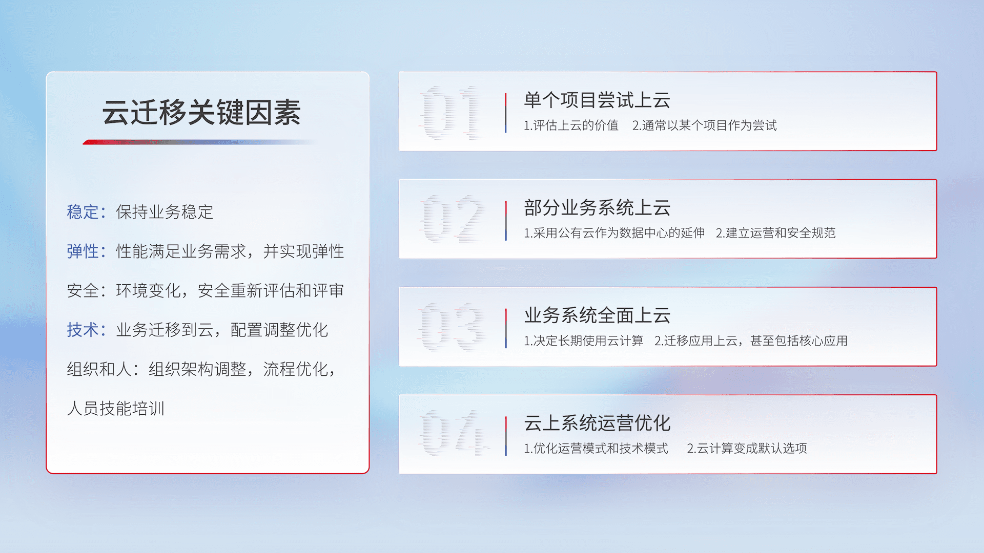 结合实际业务,,从规划设计、、、云平台选型、、、、云原生改造、、、、数据迁移、、集成交付,,迁移全过程为客户识别最佳上云路径,,,做好风险识别管理,,,设计网络架构、、、、身份权限、、、安全审计合规、、、、操作审计、、、日志审计、、、、监控告警策略、、多站点容灾设计等,,,,对云上基础设施进行整体规划,,,提升IT治理水平,,,以满足弹性、、、高可用、、高性能的需求。。。
