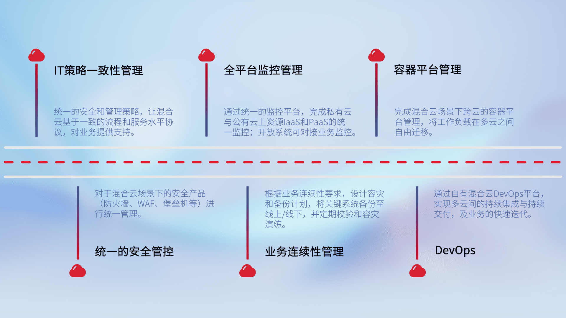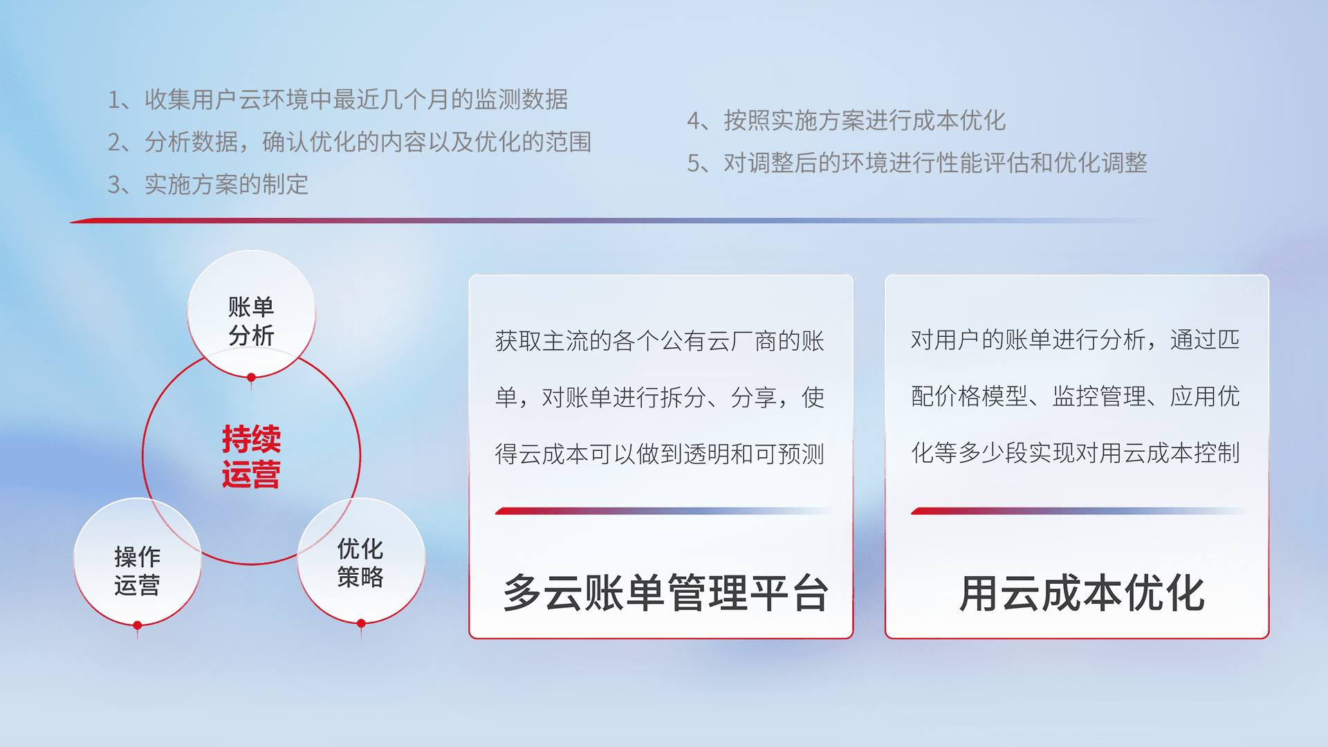 通过多云纳管,,,,以统一的资源数据模型把客户的云资源进行抽象和封装,,,进而实现对多云资源的统一操作,,,保障云资源管理的可靠性、、、、稳定性与可用性。。。。量身定制化运维内容,,,配置、、、开发运维、、、补丁管理、、备份、、、、监控、、、认证和访问管理、、审计和日常巡检等,,保障在用云过程中的可靠度,,,稳定度以及高可用率。。。
